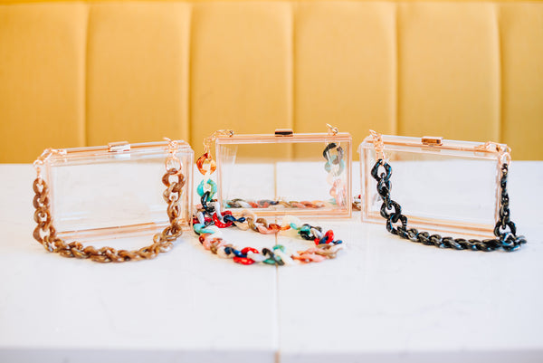 Perfect for catching all the vibes at concerts and events, this acrylic clutch is your go-to accessory. Wear it as a standalone clutch or switch it up with the included chain for crossbody styling. Measuring 7¼" × 4¼" × 2", it fits a 4" × 7" canvas insert perfectly. Mix and match with our chunky link bag straps to create your own signature look.